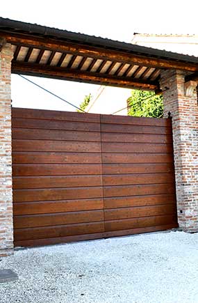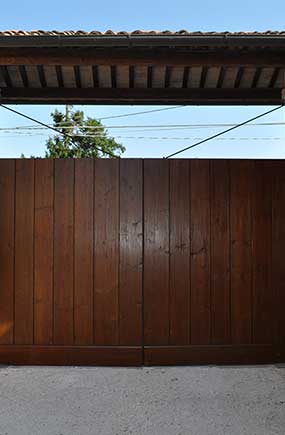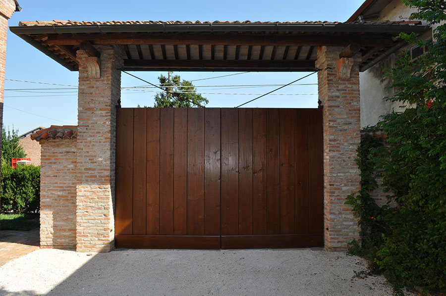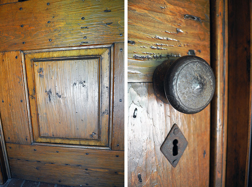 in legno di abete piallata a mano con chiodi ribattuti e inferriata antica nella parte superiore.